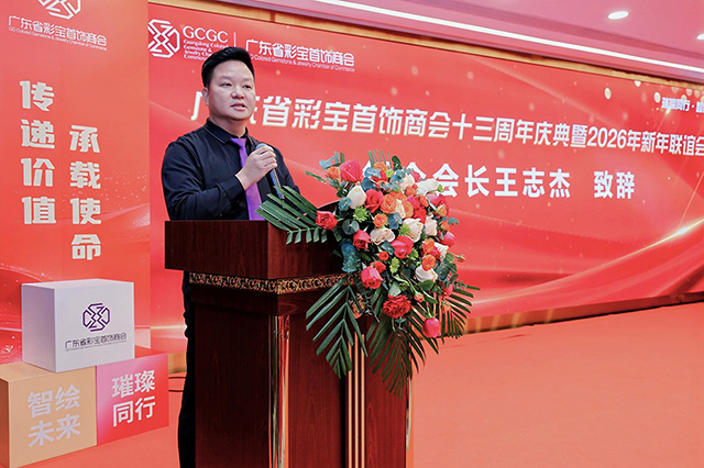 2026年1月8日晚,广东省彩宝首饰商会在广州迎宾馆举办了“璀璨同行·智绘未来”商会13周年庆典暨2026新年联谊会。当天邀请到了多位行业内的商协会会长及嘉宾,连同商会会员共250余人参加了庆典。