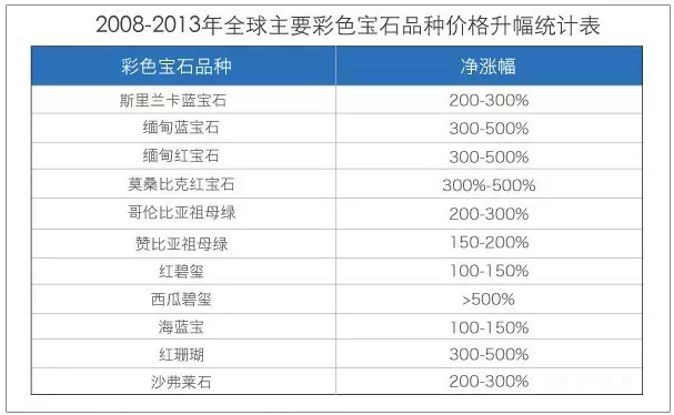 据不完全统计,2008年到2014年之间,各类名贵彩色宝石价格涨幅如下: